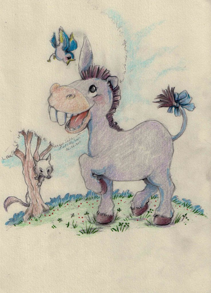 So the merchant decided to keep the little donkey. The son called him Donkute and used to take him everywhere he went, even when he wanted to play with his friends. He was such an obedient pet and was kind to the little boy and his friends. Everyone used to laugh at the little donkey because of his ear and teeth. Of course he didn’t know the reason for their laughter and thought they were just being friendly.