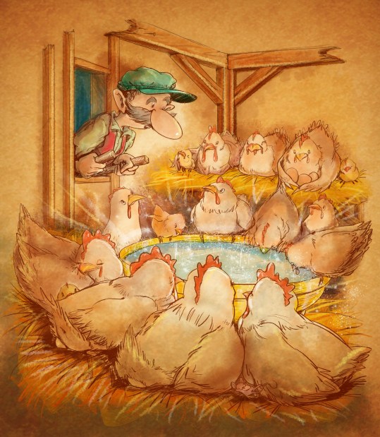 He suddenly saw a golden bowl on the ground full of glittering water from which all the hens were drinking. It was as if they were dancing to the tune of the farmer’s song.
