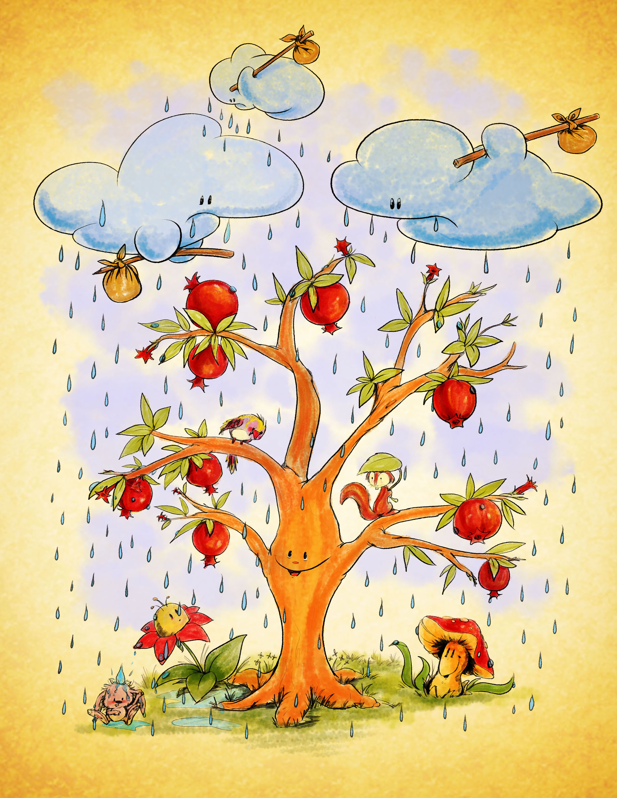 That week, there was lots of rainfall. The pomegranate tree was fed up with rain.